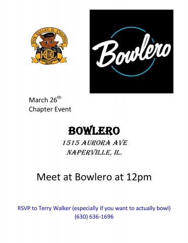 Bowlero Naperville-1515 Aurora Ave, Naperville 12pm, Terry Walker Please RSVP to Terry Walker if you plan on bowling so we can have an accurate head count. 6306361696