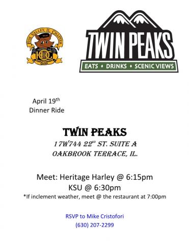 Dinner Ride- Twin Peaks-17W744 22nd St Suite A, Oakbrook Terrace-Meet at Heritage Harley at 6:15pm, KSU at 6:30pm. If inclement weather meet at the restaurant at 7:00pm Contact Mike Cristofori to RSVP 630-207-2299