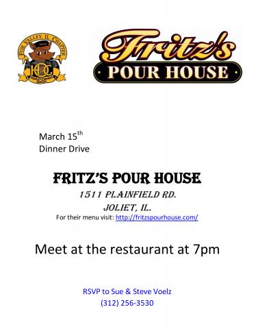 Meet at restaurant at 7pm 1511 Plainfield Rd, Joliet Please RSVP to Sue Voelz if you plan on attending so we can have an accurate head count. 3122563530